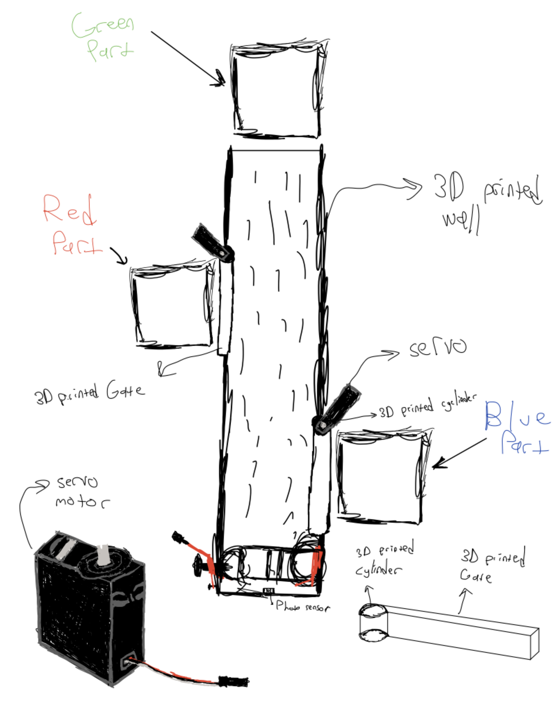 Design of the servo holder and gate integrated into the system can be seen below: