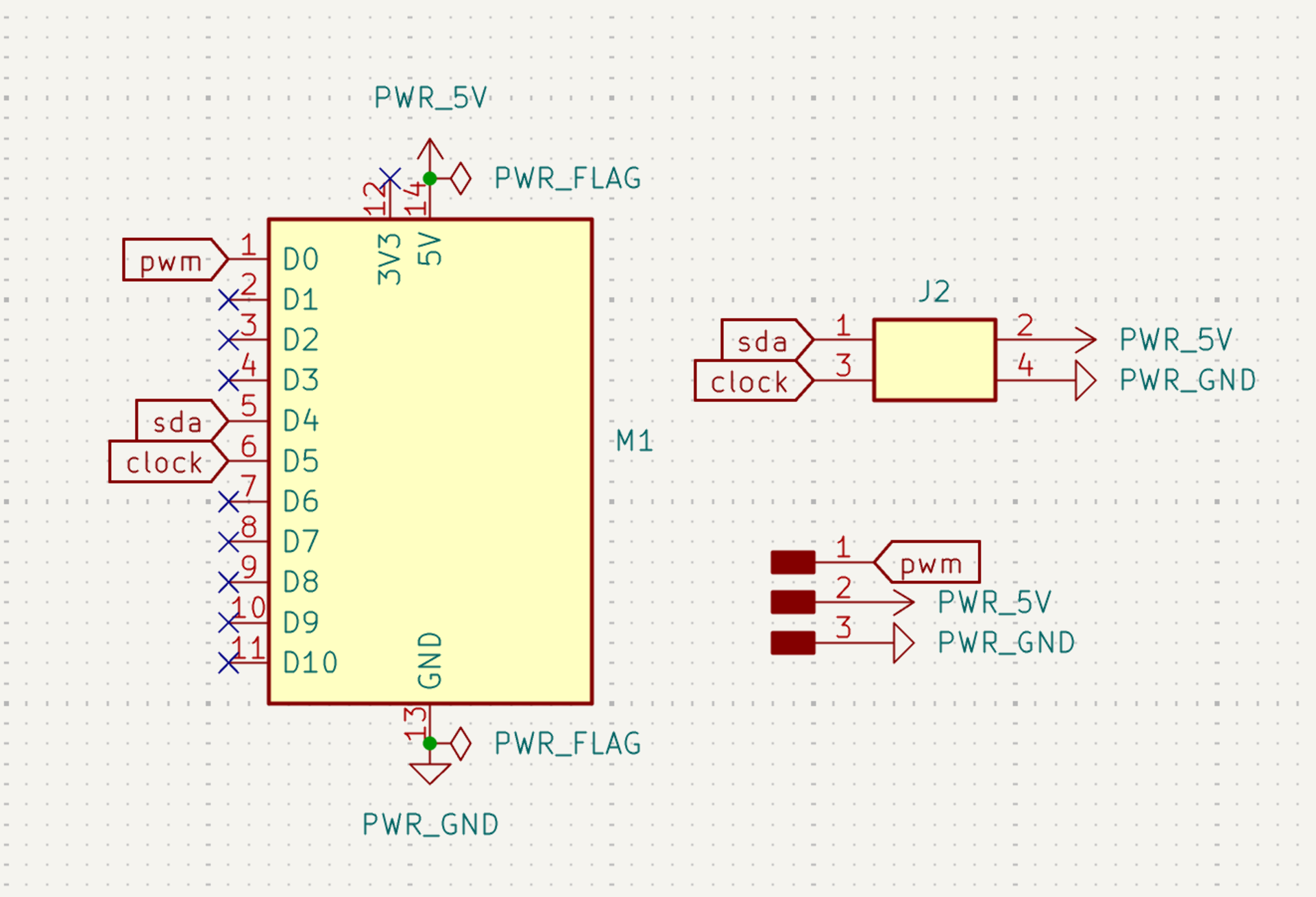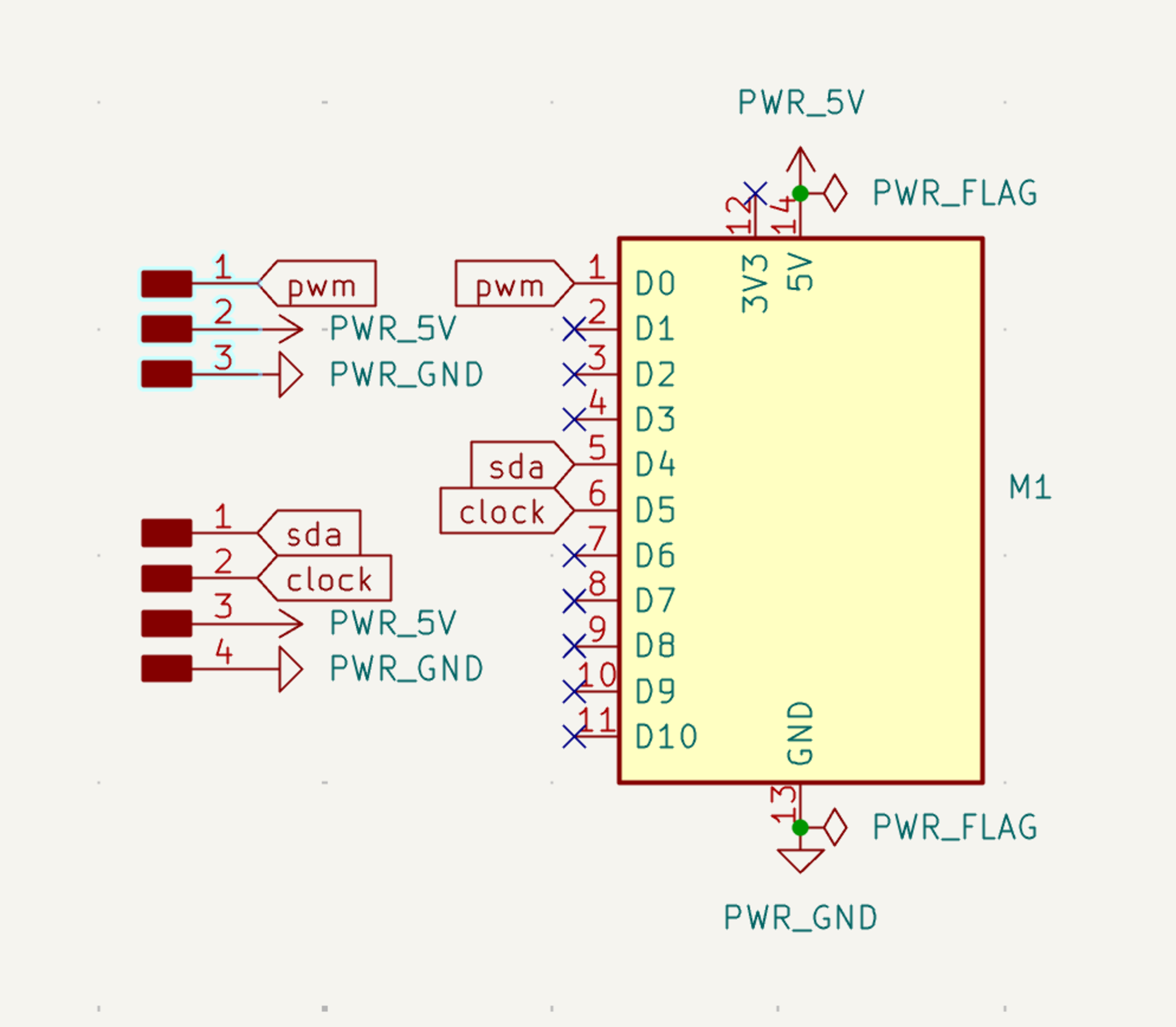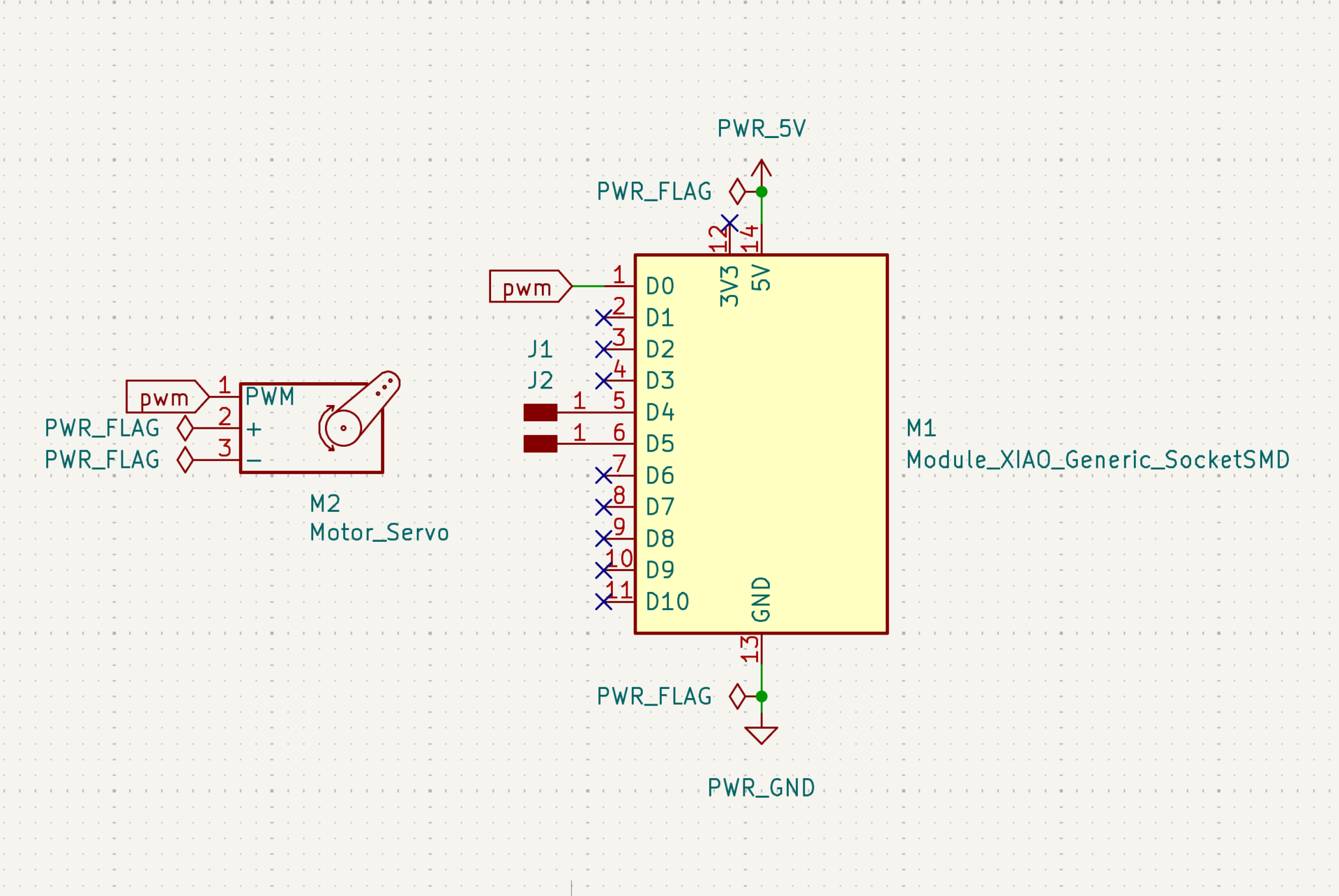 Now my task was to design a board that controls a servo motor with a microcontroller. First I imported the symbol “Module_XIAO_Generic_SocketSMD” in place of my ESP32 microcontroller. Then I made my first mistake of importing a symbol for my servo motor when my servo motor actually wasn’t supposed to be on my board. The servo motor will be connected using jumper cables to the custom board. I created two separate pin headers for the i2c connections on D4 and D5 (SDA and SCL). Then I connected a GPIO pin, GND and 5V to the servo using flags. My schematic of this mistaken design is below: