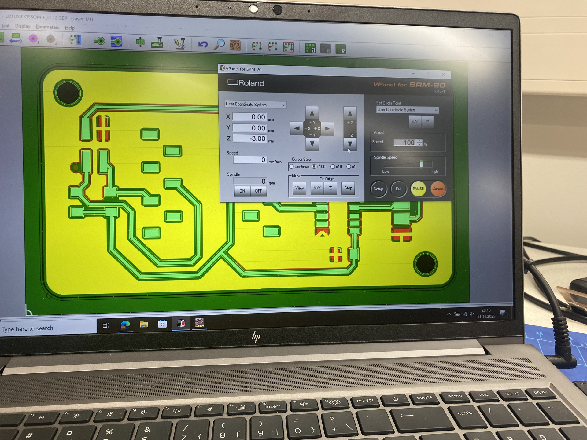 Then we set the origin, adjust the height (up the z by 3 mm), screw the machine drill that has 0.8 mm diameter but be sure to make it not too tight. Then from the computer we enter the drill.rml and edges.rml for the 0.8 mm drill. Then we repeat same process with a 0.2 mm diameter drill and the cu.rml and user1.rml files. Below is the control computer (The CopperCAM in the background ISN’T MINE! I only used the vPanel software):