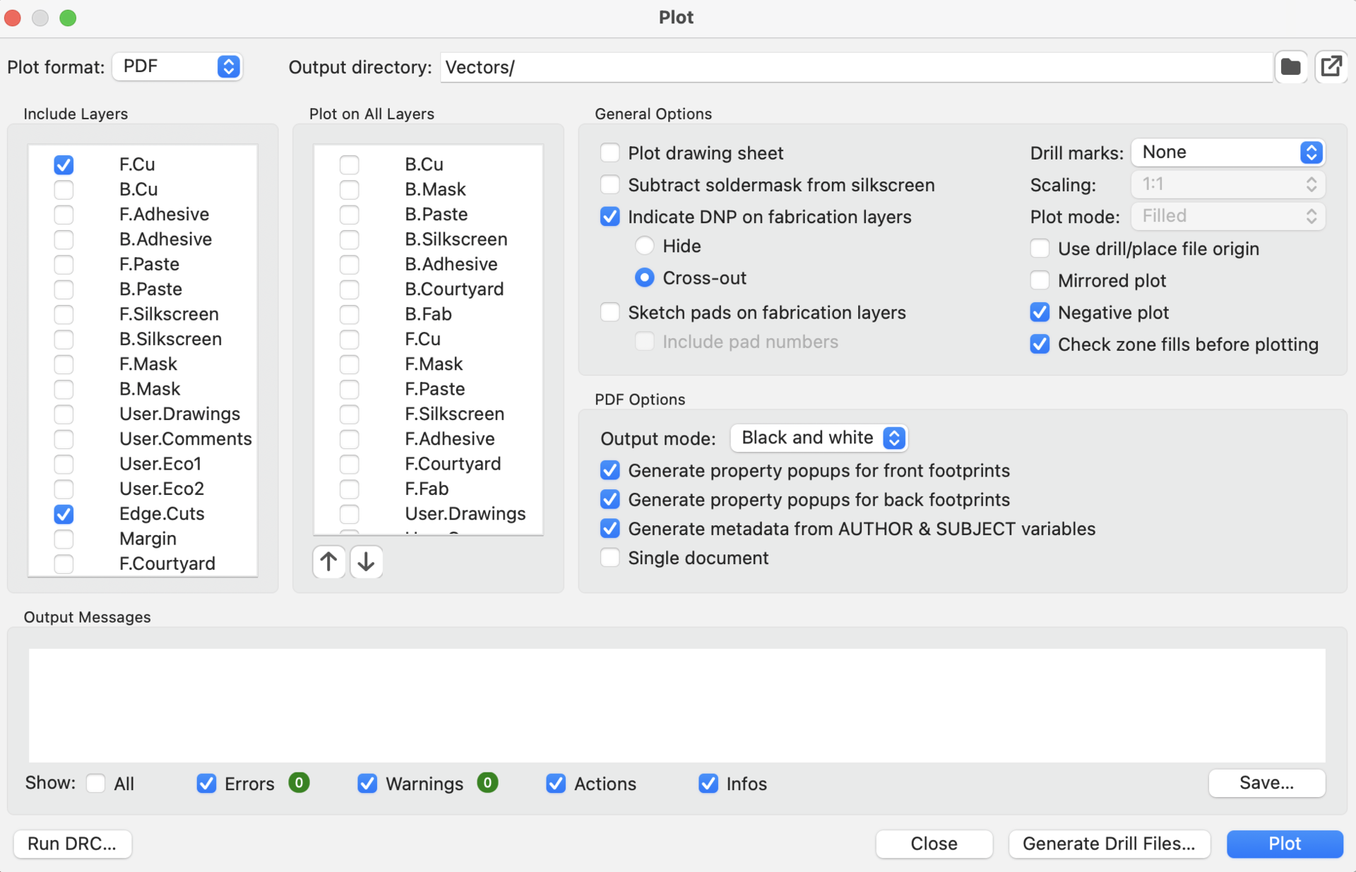 You can see the plot menu below to export pdf’s. We export with negative plot checked. The reason we don’t export SVG’s is because the KiCad SVG export is broken. So we first export PDF then transfer it to SVG using Inkscape.