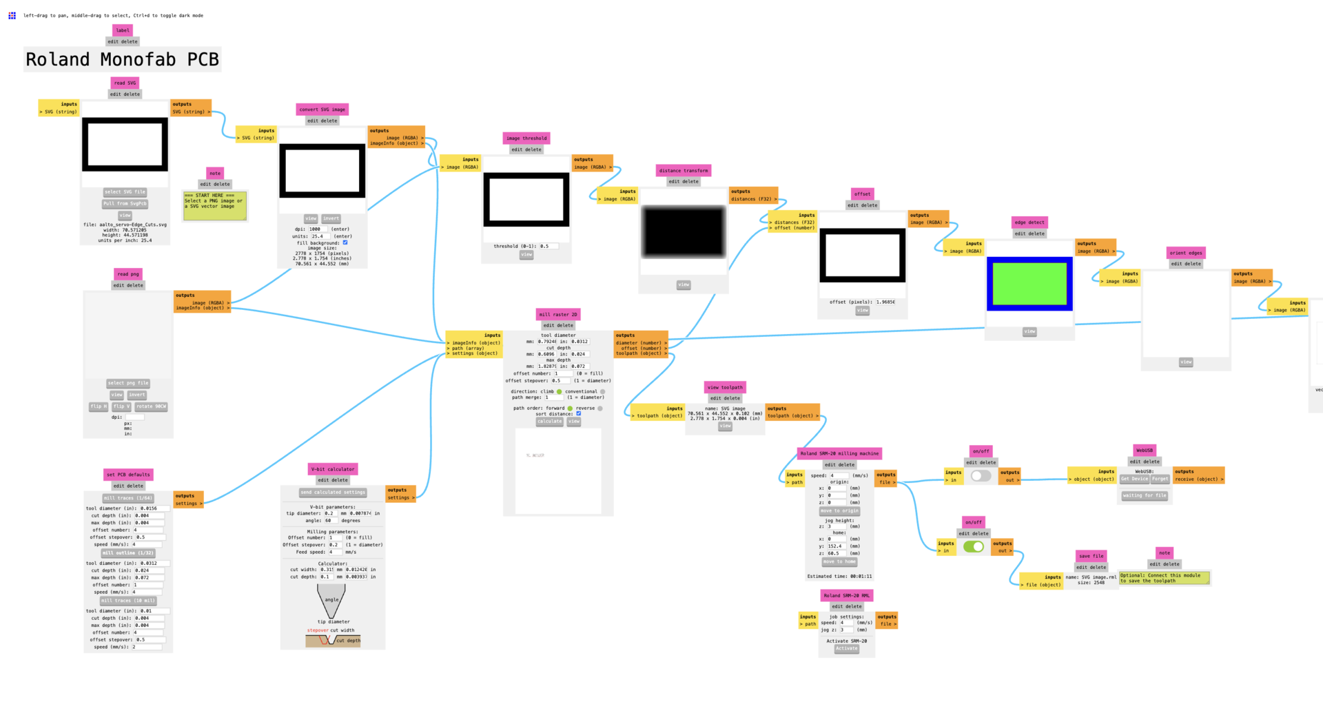 Below you can find the https://modsproject.org/ website’s page for the programs, open program, Roland SRM-20 mill, Mill 2D PCB. You can see the UI layout below. We start by uploading the svg of the layer.