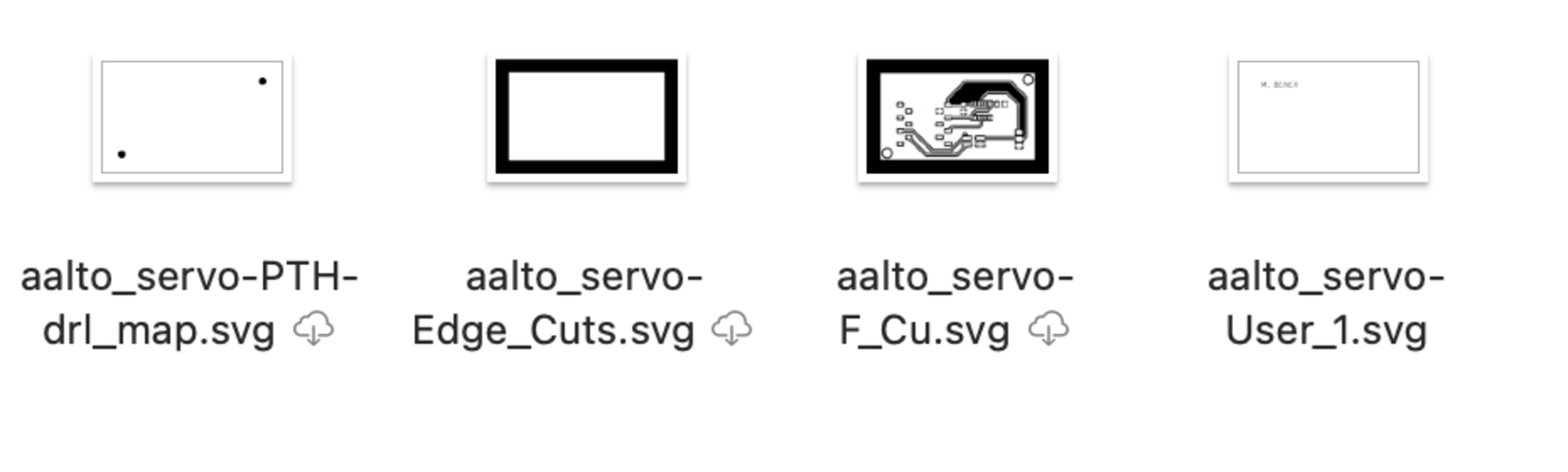 The svg files can be seen below that are exported from Inkscape. In Inkscape I resized and changed color and exported as svg as you can see below. I resized the pdfs all to the same size while I changed the colors from black to white in the drill map and text for the software to recognize the black parts as the milling parts.
